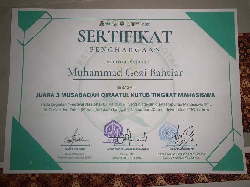 Ahad, 9 November 2025 — Program Studi Ilmu Al-Quran dan Tafsir (IAT) Institut Daarul Quran (IDAQU) Jakarta kembali menorehkan tinta emas di ajang nasional. Salah satu mahasiswa terbaiknya, Muhammad Gozi Bahtiar, berhasil mengharumkan nama kampus dalam Festival Nasional IQTAF 2025 yang diselenggarakan oleh Himpunan Mahasiswa Ilmu Al-Qur`an dan Tafsir (HIMA-IQTAF) Universitas PTIQ Jakarta pada 8 November 2025.